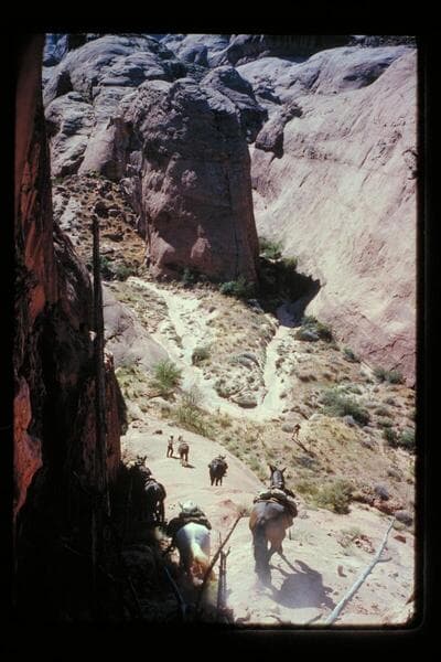 Toby Owl leads his horse on rebuilt trail near mouth of Nasja Creek