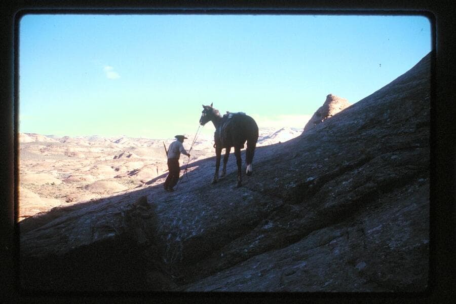 Dan Lehi and horse up trail east of Dead Center Camp on return from mouth of Nasja Creek