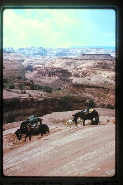 Leading the stock along a ledge in the bald rock crossing from Little Junction Creek to Bald Rock Creek