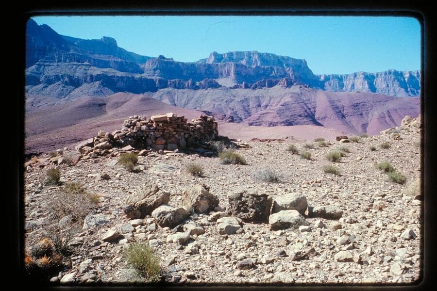 Cardenas Creek at left and Unkar Rapid at right. From North Rim. The Fort is above the middle of the print