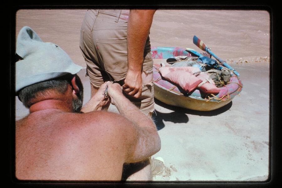 Up at mouth of Travertine Creek; Buzz has pants trouble; Mile 229.4