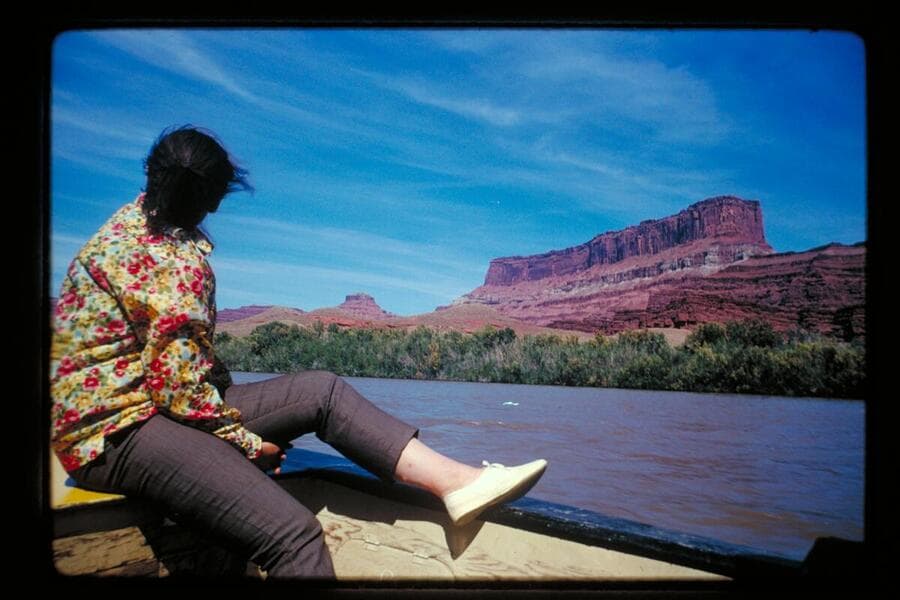 Virginia Hough studies Jackson Hole area at left bank, about Mile 50