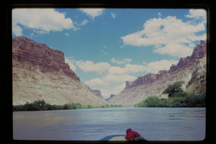 Across Spanish Bottom and the Colorado River from the trail from the rim down to Spanish Bottom