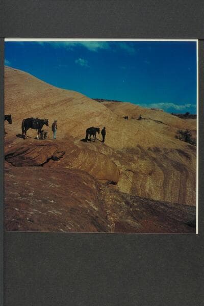 Leading stock past narrow ledge on bald rocks between Little Junction Creek and Bald Rock Creek