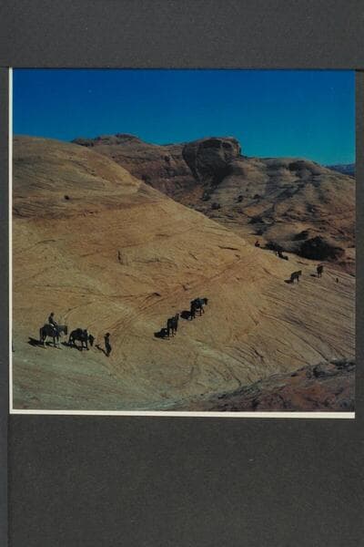 Pack string on the slick rock west of Nasja Creek as they swing into the basin of Dead Center Camp