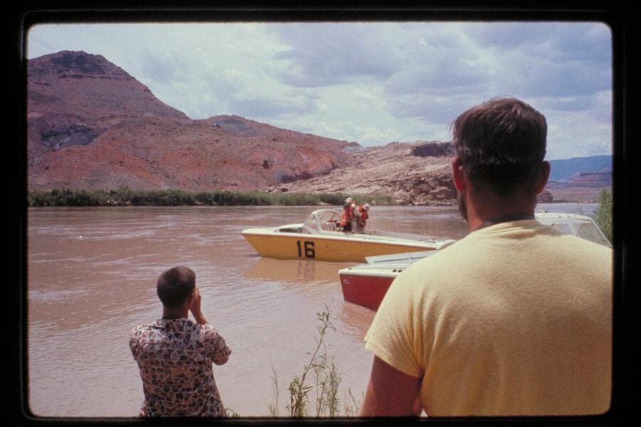 Launching the "Big Red" at Lees Ferry. The "Wee Yellow" is pulling it off the trailer