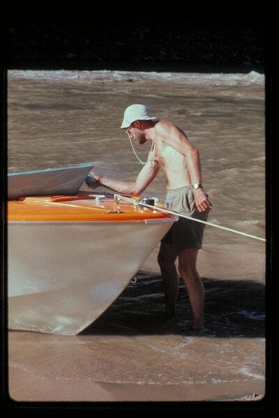 Painting the forward deck of the "Kiwi" at camp at the foot of Vulcan Rapid
