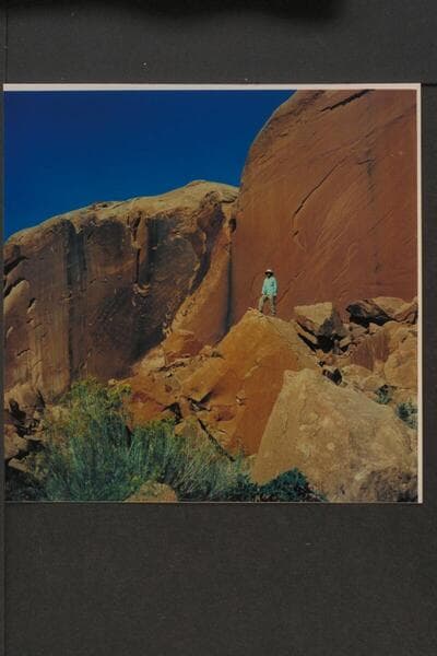 Harry Aleson standing on rocks back of site of dredge assembly, Mile 122.8