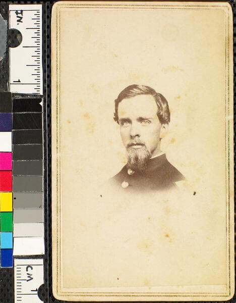 A bust-length studio portrait of Union First Lieutenant (later Captain) Cyrus R. Blodgett of the 22nd Colored Infantry Regiment, turned slightly to the right. Blodgett has a neatly trimmed mustache and a wide goatee. "Kimberly Bros, National Gallery, Fortress Monroe." stamped in black on the verso.