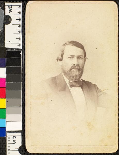 A bust-length studio portrait of an unidentified man, possibly Levi Graybill (see HM 77704 for an image of Graybill in military uniform), turned slightly to the left. The man has a neatly trimmed mustache and short but bushy mutton chops. He is wearing a suit with a small bowtie. "F. Gutekunst ; No. 704 & 706 Arch St. ; Philadelphia" and an armorial crest are printed on verso. There is a green and white three cent stamp with a portrait of George Washington attached to the verso.