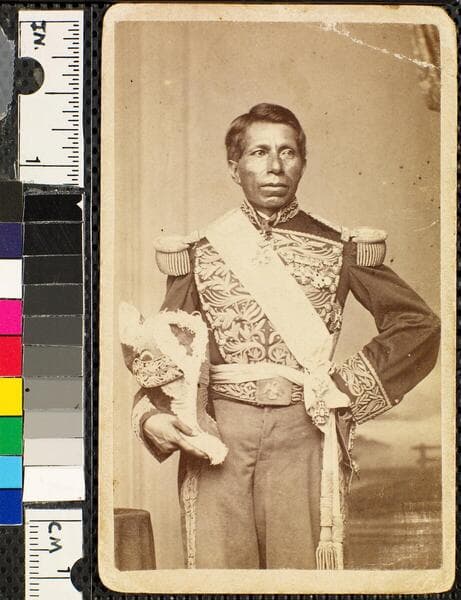 A bust-length studio portrait of Mexican General Juan Cortina turned very slightly to the right. Cortina has a neatly trimmed mustache and beard, his hair is parted on the left, and he is wearing a suit with bow tie.
