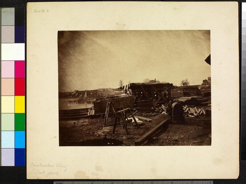 Track near the Potomac River, in Alexandria. Lumber; part of construction force at work. Title on mount: Framing Yard, Construction Corps. Handwritten in upper left corner: No. 29.