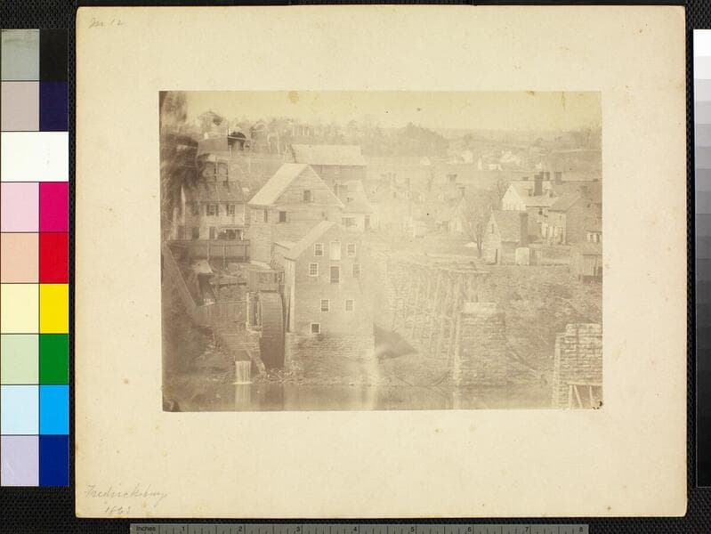 View of Fredricksburg, Virginia, from across the Rappahannock River. Taken before the battle of May 3, 1863. No Union troops are visible. This image similar to photCL 301 (64), (73) & (78). Title on mount: Fredricksburg below RR Bridge 1863. Handwritten in upper left corner: No. 3 .