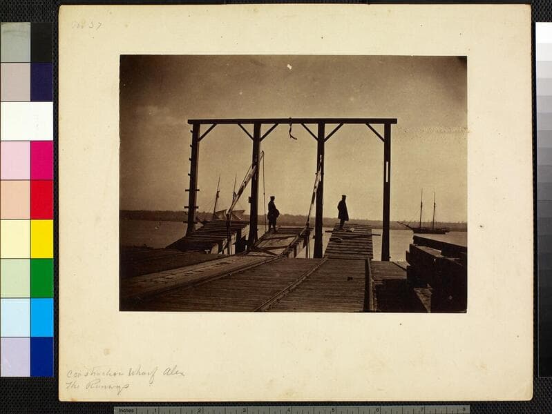 A view from the shore of the coal wharf in Alexandria, Virginia. In the center of the image, tied to the wharf are a number of vessels, including the paddle steamer "South America" and, to the right, a smaller steam vessel "Titan". Two men are sitting in the foreground observing the wharf; a woman can be seen partially along the left edge of the image. This image similar to photCL 301 (10). Title on mount: Coal Wharf, Alexandria Va. Handwritten in upper left corner: No. 23.