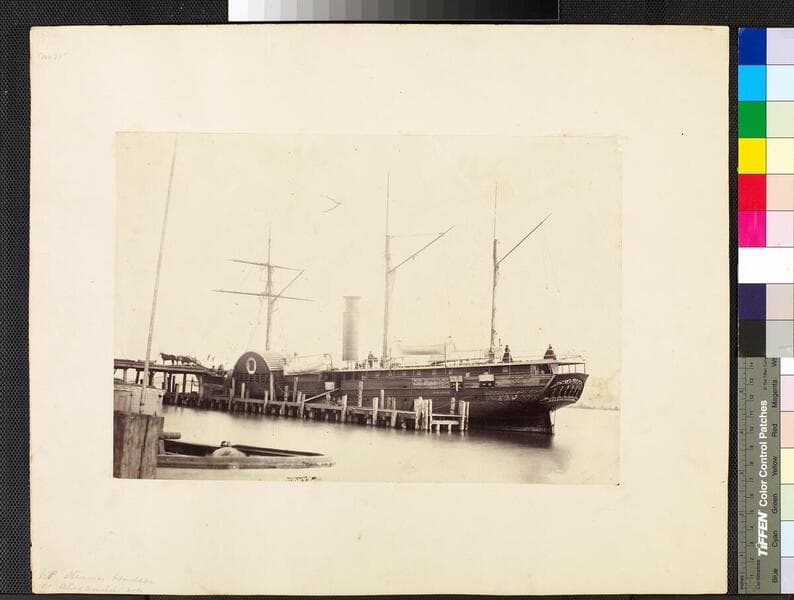 A view from the shore of the coal wharf in Alexandria, Virginia. In the center of the image, tied to the wharf are a number of vessels, including the paddle steamer "South America" and, to the right, a smaller steam vessel "Titan". Two men are sitting in the foreground observing the wharf; a woman can be seen partially along the left edge of the image. This image similar to photCL 301 (10). Title on mount: Coal Wharf, Alexandria Va. Handwritten in upper left corner: No. 23.