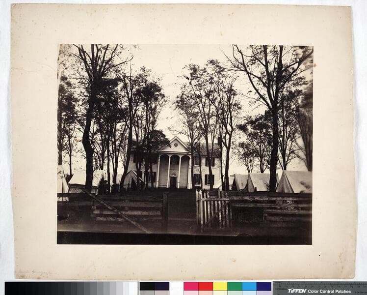Gen. George G. Meade's headquarters, Wallack's house, Culpeper, Virginia. Ten military men sit or stand in front of white pitched tents and the house. This image similar to photCL 301 (48). Title on mount: Gen. Meade's Headquarters Culpeper 1863. Handwritten in upper left corner: No. 62.