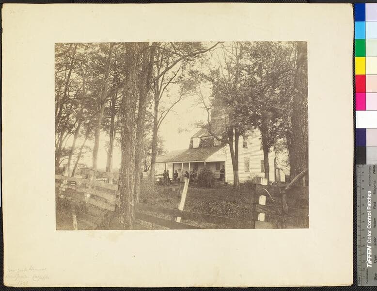 Gen. George G. Meade's headquarters, Wallack's house in Culpeper, Virginia. Several white pitched tents and a few men stand between the wooden fence in the foreground and the house in the background. This image similar to photCL 301 (49). Title on mount: Meade's Headquarters Culpeper. Handwritten in upper left corner: No. 63.