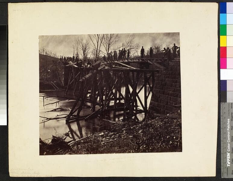 Construction Corps repairing Bull Run Bridge washed out by high water, 1862