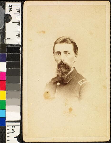 A bust-length studio portrait of Union Captain Albert Janes of the 22nd Colored Infantry Regiment, turned very slightly to the left. Janes has a full mustache and goatee that reaches his collar.