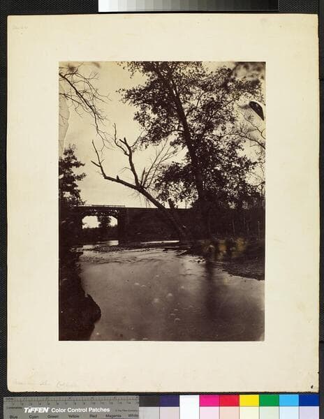 Large group of men working on railroad bridge over the Bull Run River in Virginia. Title on mount: Construction Corps repairing Bull Run Bridge washed out by high water, 1862. Handwritten in upper left corner: No. 55.