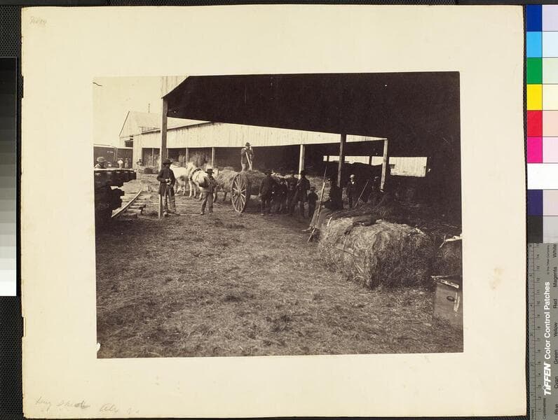 Several men working in the framing shed at the Alexandria shipping yard. Title on mount: Framing shed Alex. Construction Corps. Handwritten in upper left corner: No. 53.