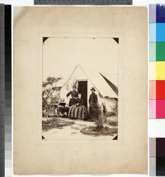 Major Allcock (standing at right), Mrs. Filley, Lieut. Filley, Co. E., and the Filley’s daughter at an unidentified battlefront