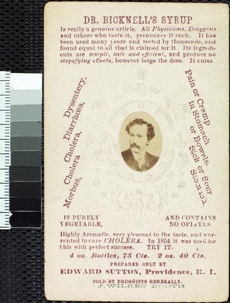 A cartes-de-visite advertisement for a "cure-all" product called "Dr. Bicknell's Syrup", with a bust-length oval-shaped portrait of Abraham Lincoln in the center.