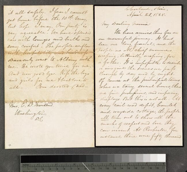 Scrapbook of nine items related to the nationwide funeral and mourning ceremonies for President Abraham Lincoln between April and May 1865. Items include special train schedules (including one printed on silk), a railroad pass; a governmental pass to view and/or accompany the presidential remains; a mourning badge with an original tintype photograph of President Lincoln; and a letter from General Edward D. Townsend, officer in charge of escorting the remains from Washington, DC to Springfield, Ill., written to his wife "Nannie" on April 28 1865, recounting his emotions and experiences. The original compiler of the scrapbook is unknown. It has been attributed to E. D. Townsend, but the materials used to make the scrapbook (binding, type-written labels, etc.) date from the mid-20th century.