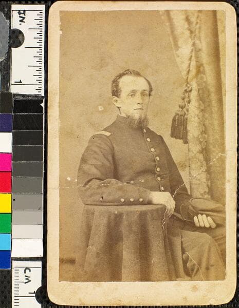 A bust-length studio portrait of Union First Lieutenant (later Captain) Cyrus R. Blodgett of the 22nd Colored Infantry Regiment, turned slightly to the right. Blodgett has a neatly trimmed mustache and a wide goatee. "Kimberly Bros, National Gallery, Fortress Monroe." stamped in black on the verso.