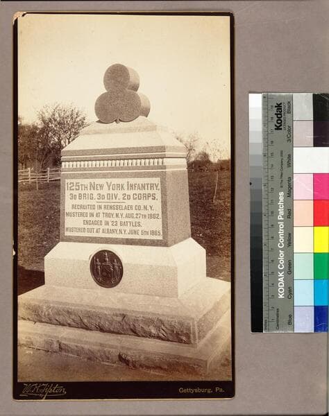 Image of a tall circular monument to the 120th New York Infantry. There is a bronze tablet above the base which reads: The One Hundred And Twentieth / New York Infantry / held this part of the line / on the second day of July 1863. / Present for duty, / 30 officers, 397 men, total 427. / Casualties, / from the War Department, / killed in battle, / 8 officers, 25 men. / Wounded, / 10 officers, 144 men. / Missing 17, Total 204. There are farm building in the distance behind the monument. The photograph has been affixed to a card with the photographer's signature and "Gettysburg, Pa." printed in gold lettering at the bottom.