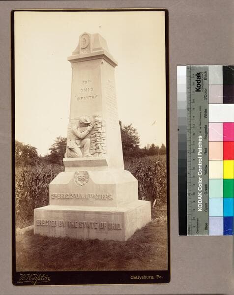 Image of a large block of stone with a carving of a soldier's tent, two muskets, and other kit in the center. Carved on either side of the central carving: 29th Ohio Infantry. At the base of the monument: 1st Brig. 2nd DIv. 12th Corps. / This memorial is erected by the / State of Ohio. The photograph has been affixed to a card with the photographer's signature and "Gettysburg, Pa." printed in gold lettering at the bottom.