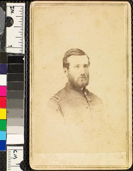 A bust-length studio portrait of Union Second Lieutenant James Ernest Schwartz (1843-1900) of the 22nd Colored Infantry Regiment with his head turned slightly to the right. Schwartz is wearing a hat, has a neatly trimmed mustache, a clean-shaven chin, and muttonchops that reach past his collar. "Brady's National Photographic Portrait Galleries ; No. 352 Pennsylvania Avenue, Washington, D.C. and Broadway & Tenth St., N.Y." printed in black on verso.
