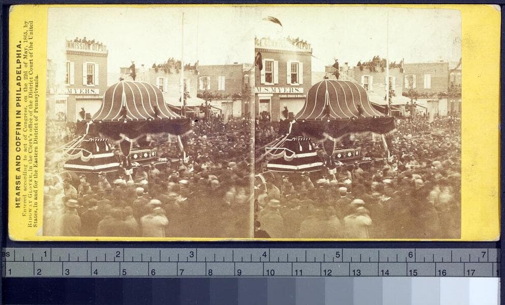 Image of a large, open hearse, draped in black and white, carrying the casket of President Abraham Lincoln, surrounded by a crowd. The hearse is viewed from behind.