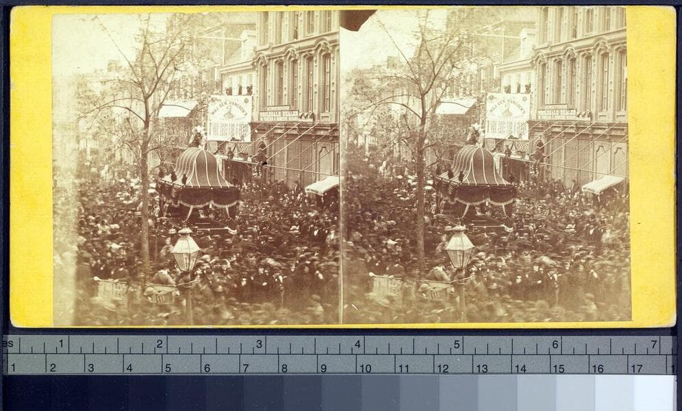 Image of a large, open hearse, draped in black and white, carrying the casket of President Abraham Lincoln, surrounded by a crowd. There are buildings in the background, people standing and sitting on the roofs.