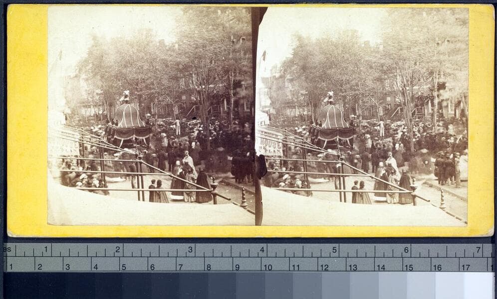 Image of a large, open hearse, draped in black and white, carrying the casket of President Abraham Lincoln, surrounded by a crowd. There are buildings in the background, people standing and sitting on the roofs.