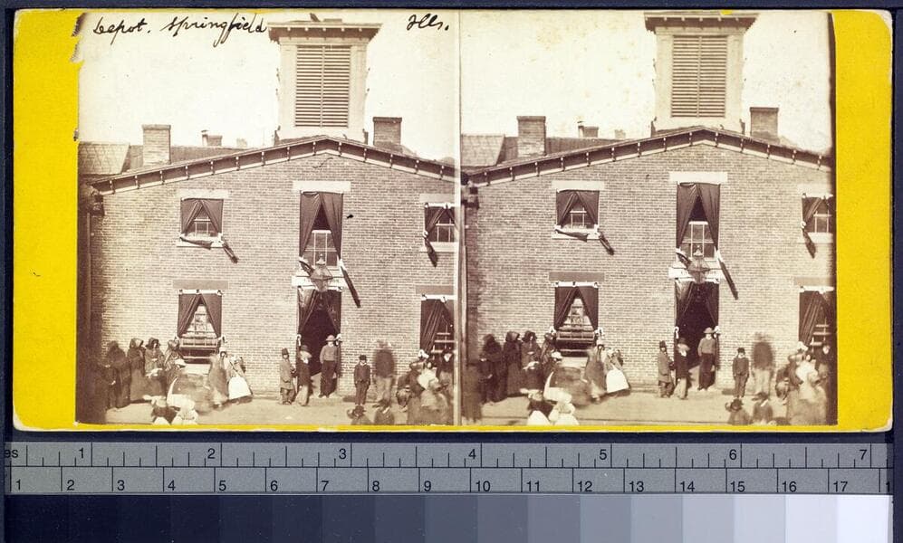 Image of the Indiana State House in Indianapolis, its columns wrapped in black bunting, the hearse that carried Lincoln in front. In the near foreground are various wagons and hoses.