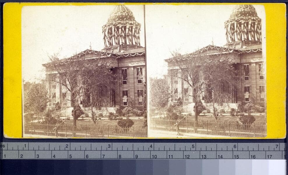 Image of the Indiana State House in Indianapolis, its columns wrapped in black bunting, the hearse that carried Lincoln in front. In the near foreground are various wagons and hoses.