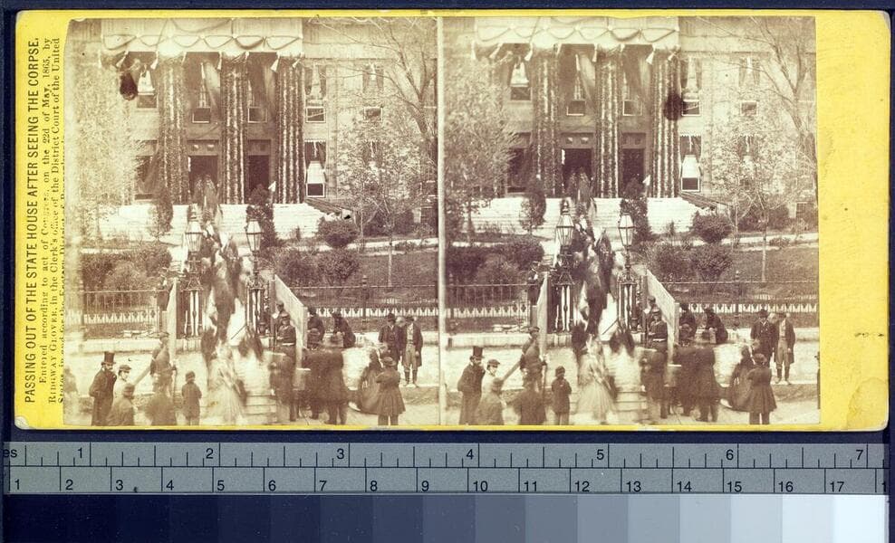 Image of the State House from the street, the columns covered in black, the dome also draped in black bunting. There is a soldier standing guard outside the fence.