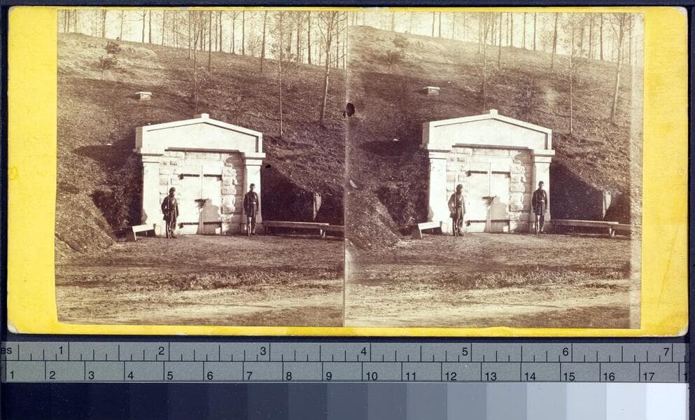 Image of Lincoln's Tomb, two guards in front. There is a group of five men to the right of the image, three more men standing behind them. On the left there is a single man stand near the guard, two boys sitting on a bench to the guards right. On the hill above is small unit of troops in formation. There is a printed paper label along the right edge of the recto side.