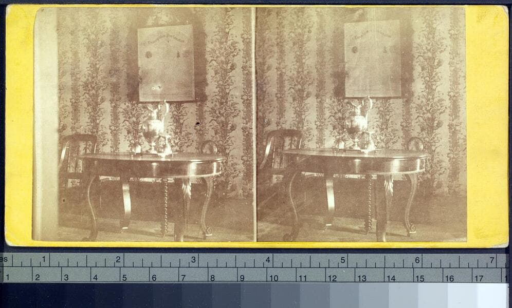 Image of Lincoln's Springfield, Ill., home draped in black. There is a printed paper label along the left edge of the recto side.