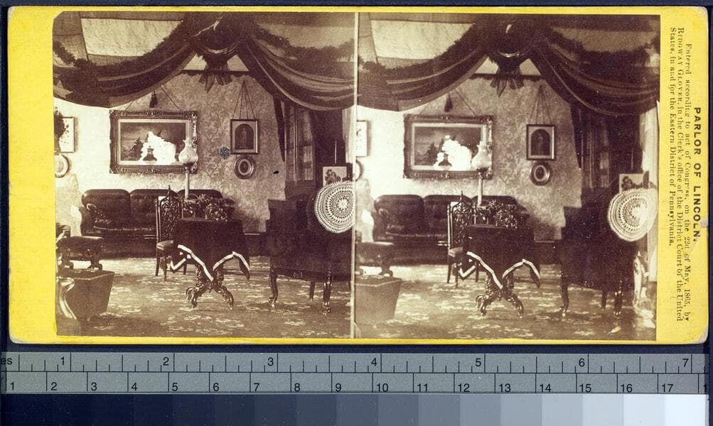 Image of table with a ewer and two glasses. Hanging on the wall, draped in black, is a framed broadside entitle, Facsimile Emancipation Proclamation.
