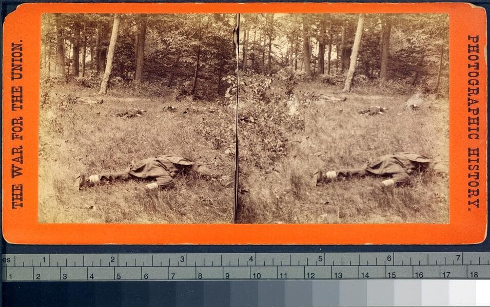 Various views of the Civil War on card mounts, 4.5 x 6 inches. All have labels for the series "Brady's Album Gallery" and are credited to photographers Mathew Brady, Alexander Gardner, or Barnard & Gibson. Subjects: Antietam battlefield and bridge; soldiers digging graves for the dead; Confederate soldiers' dead bodies at their battery; Old Capitol, Washington D. C.; Long Bridge; Christ Church, Alexandria; General McClellan's tent; Yorktown; White House residence of Col. Lee; Cornwallis' Cave; temporary hospitals; Stone Bridge, Bull Run; Mrs. Spinner's House; Quaker Gun, Centreville; Grigsby House; troops drilling at Fort Lyon; soldiers at Manassas.