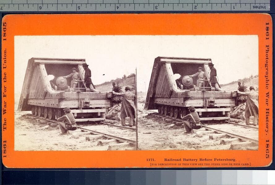 Stereograph showing Union soldiers and a civilian standing on and near a locomotive at the Richmond and Petersburg Railroad Depot which was destroyed by Confederate troops as they fled the city. Over 700 buildings in Richmond were destroyed including the one behind the locomotive.