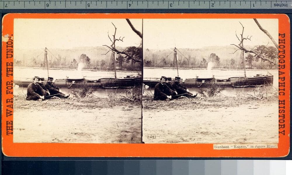 Stereograph showing the U.S. gunboat Mendota on the James River in Virginia.
