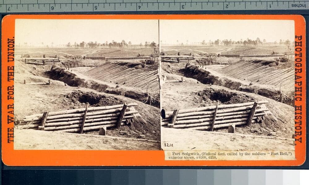 Stereograph showing a dead Confederate soldier with a musket next to him in the trenches outside of Fort Mahone, near Petersburg, Virginia, April 2, 1865.