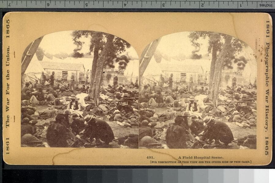 Stereograph showing dead soldiers, horses, and broken gun carriages after General Sumner's Corps charged over this field on the battlefied of Antietam on Sept. 17, 1862.