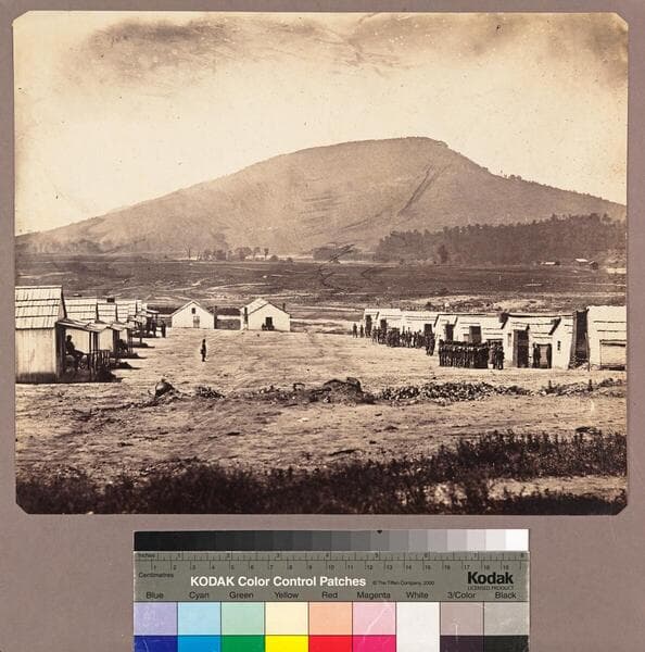 A view of Chattanooga, Tennessee, looking west toward Cameron Hill. In the foreground is a large open space, a large home set on the edge of the space. In the distance, on the right can be seen some of the tents and cabins of the Union troops, Redoubt Carpenter behind. In the middle distance, to the left, below the hill, can be seen Whiteside House, with white columns in the front, the headquarters of General Grant. On the crest of the hill can be seen another Union encampment, and, silhouetted against the sky, the guns used to command the river.