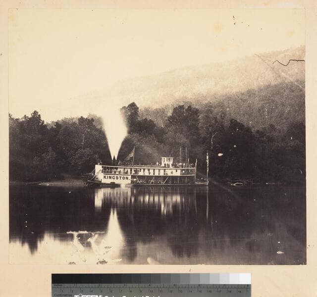 Image looking south, southwest towards Cameron Hill and Lookout Mountain, in the far distance. The bridge is protected by a blockhouse on the right and guard towers at the bridge. There is draw span in the center to let ships through. In the middle distance, to the right, at the foot of Cameron Hill is the Union Navy Yard.