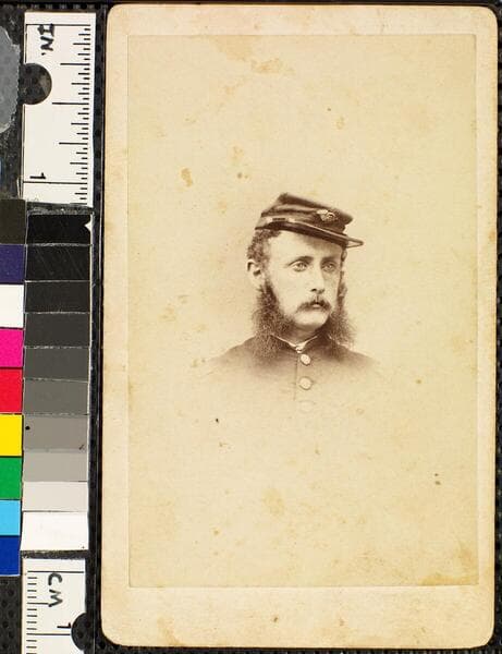 A bust-length studio portrait of Union First Lieutenant (later Captain) Cyrus R. Blodgett of the 22nd Colored Infantry Regiment, turned slightly to the right. Blodgett has a neatly trimmed mustache and a wide goatee. "Kimberly Bros, National Gallery, Fortress Monroe." stamped in black on the verso.