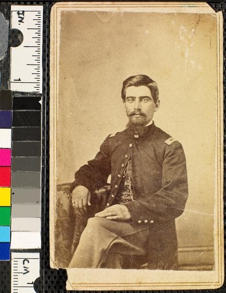 A bust-length studio portrait of Union First Lieutenant (later Captain) Cyrus R. Blodgett of the 22nd Colored Infantry Regiment, turned slightly to the right. Blodgett has a neatly trimmed mustache and a wide goatee. "Kimberly Bros, National Gallery, Fortress Monroe." stamped in black on the verso.